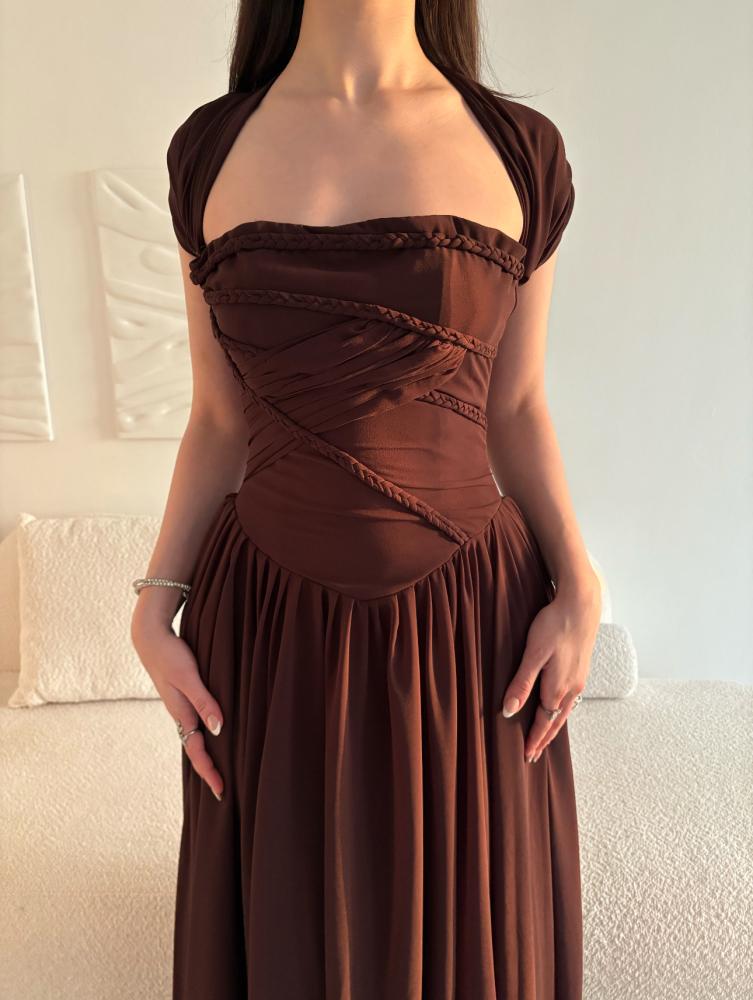 مصنوع من شيفون مطفي فخم بانسيابية ناعمة، يمنح الفستان حركة خفيفة أنثوية مع لمسة خفيفة من اللمعان الطبيعي في ضوء الغروب