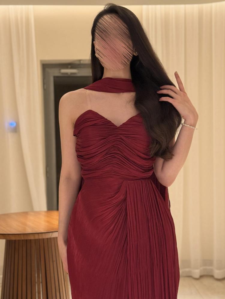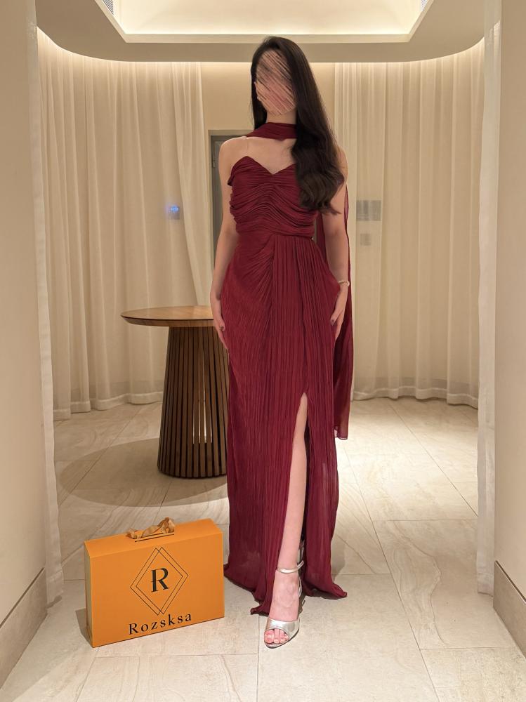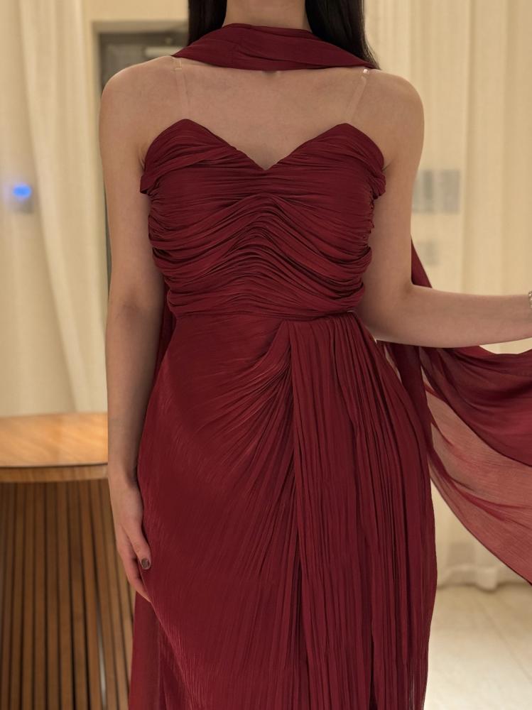 • القصّة: بدون أكمام مع درابية أمامية تعانق الجسم بانسيابية وتبرز الخصر بطريقة أنثوية ناعمة، مع وشاح خلفي طويل من نفس القماش ينسدل بخفة ليعطي لمسة درامية ساحرة عند الحركة