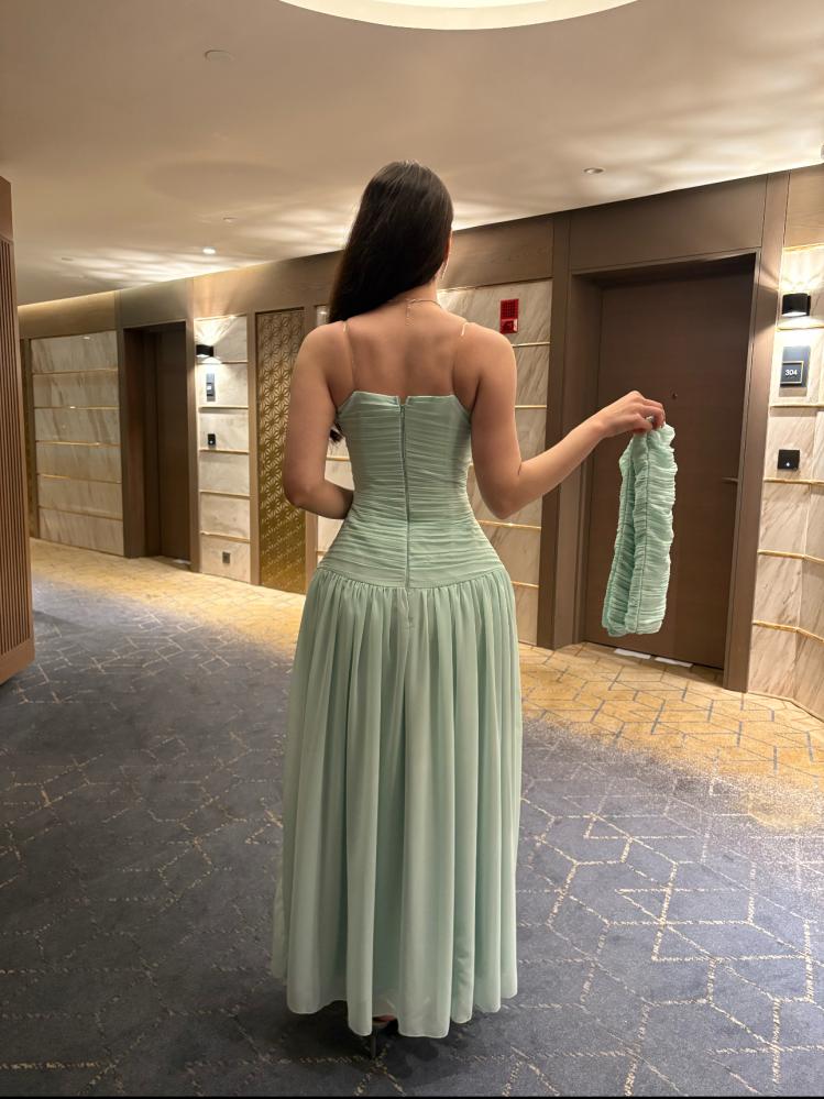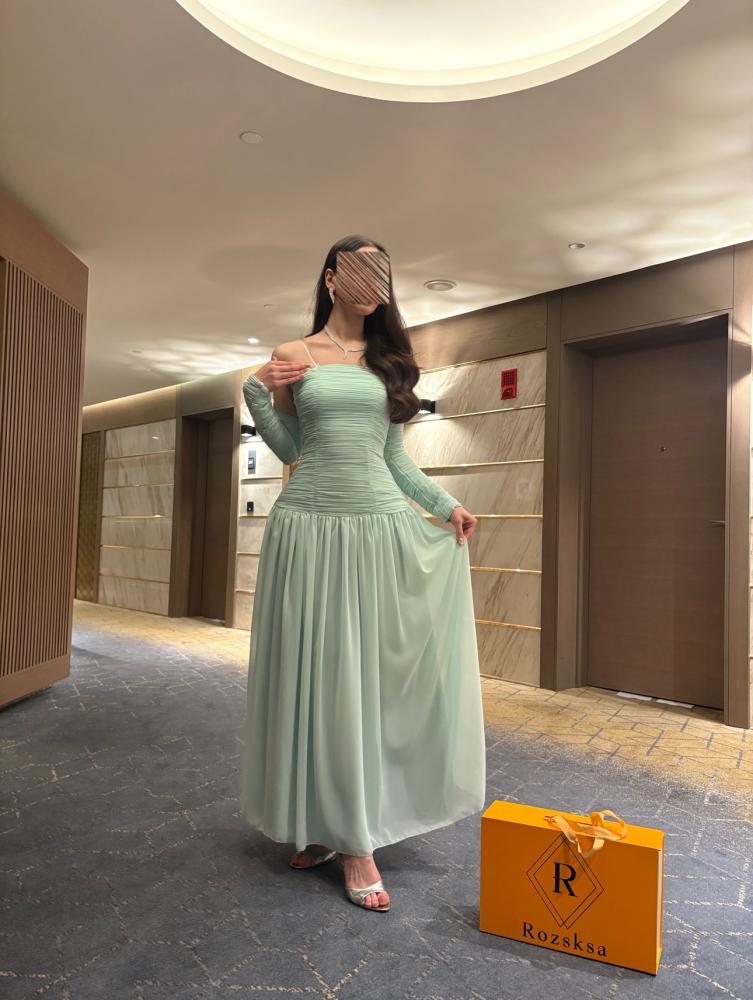 الفستان بتصميم كورسيه مطوي بقماش شيفون وجزء سفلي منسدل