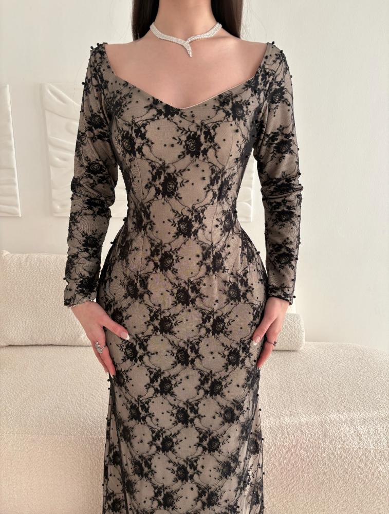فستان بيج مع دانتيل أسود مزخرف