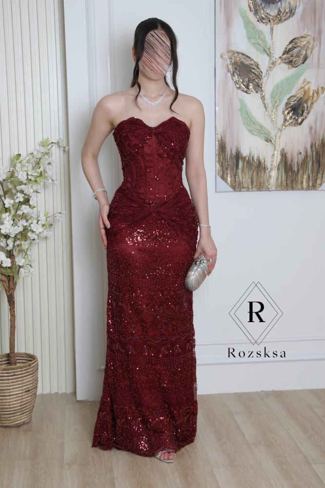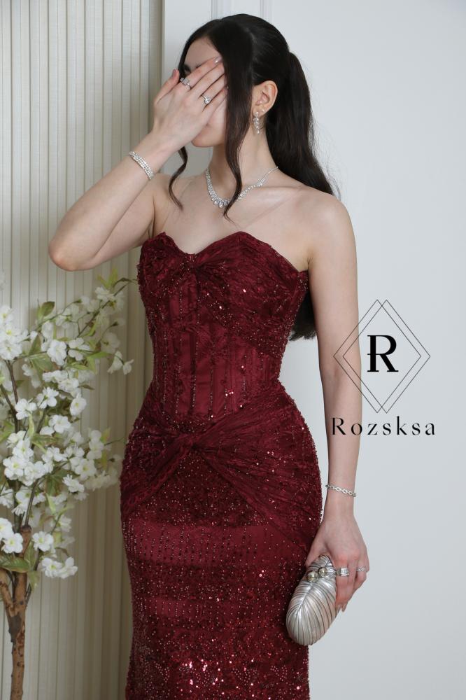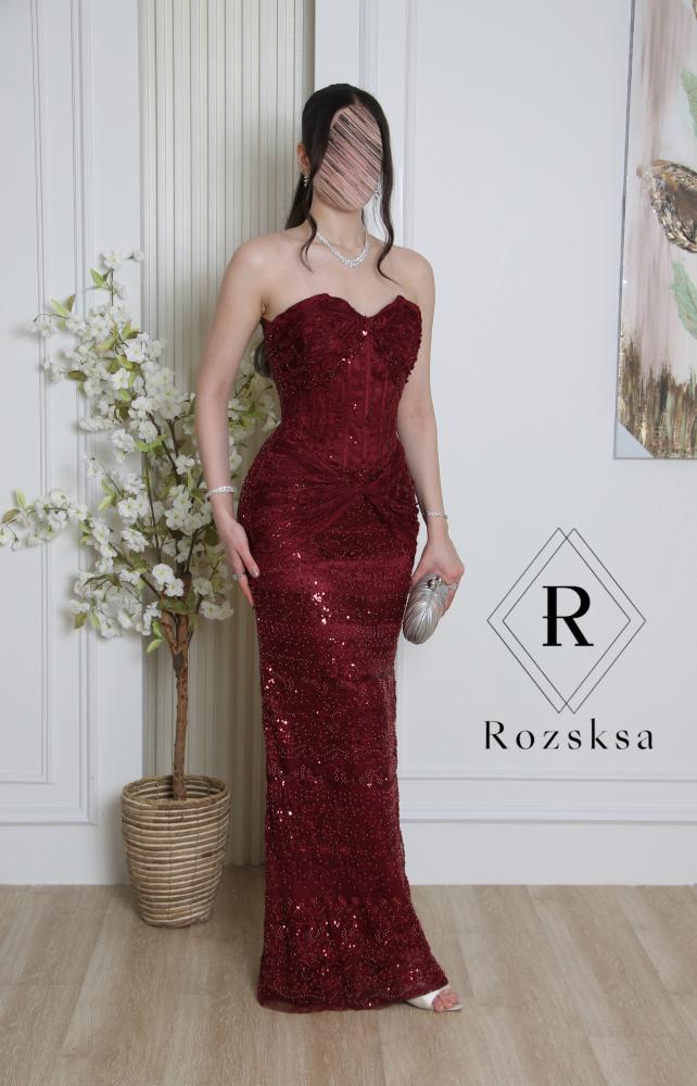 • مصنوع من قماش فاخر مطرّز بالترتر اللامع الذي يغطي الفستان بالكامل بتوزيع أنيق يخلق لمعاناً فخماً مع الإضاءة. الجزء العلوي مزين بخطوط تطريزية بارزة وبعقدة أنيقة عند الخصر لإبراز الشكل الانسيابي
