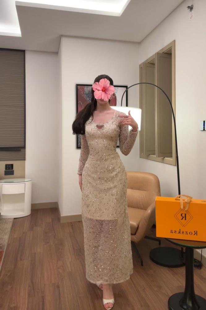• التفاصيل: الفستان مغطى بالكامل بالتطريز اللامع الذي يعكس الضوء بشكل فاخر.