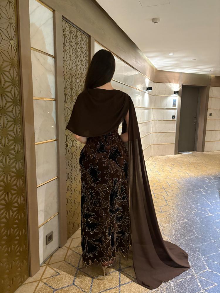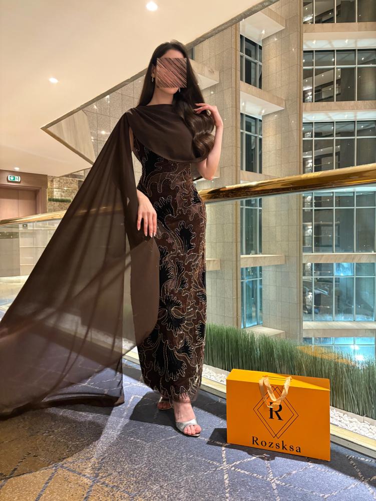 فستان ببطانه بلون البني و طبقة علويه من قماش الشيفون المطرز بالكامل بزخارف مخمليه وترتر اللامع مع قماش كريب المنسدل بنعومة من الكتف