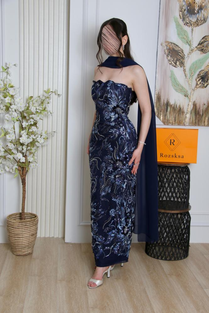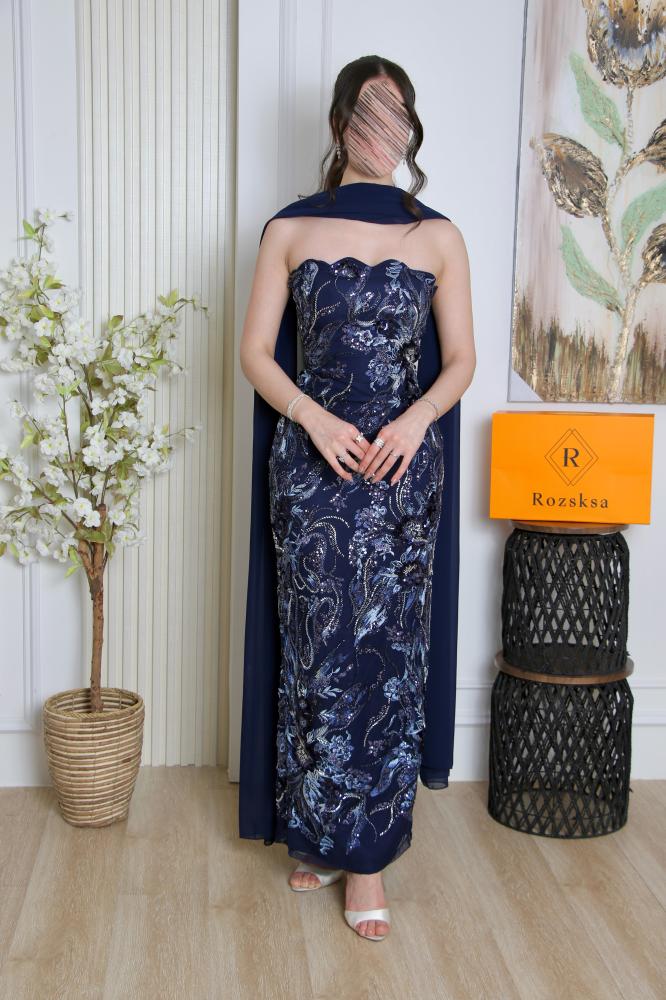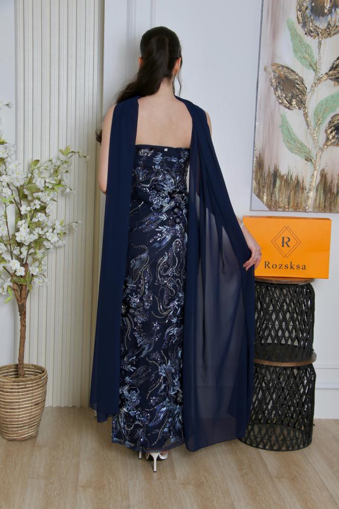 الفستان مزود بوشاح أو كاب طويل بنفس لون القماش الخلفي، مما يزيد من فخامته ويمنحه حضوراً مميزاً