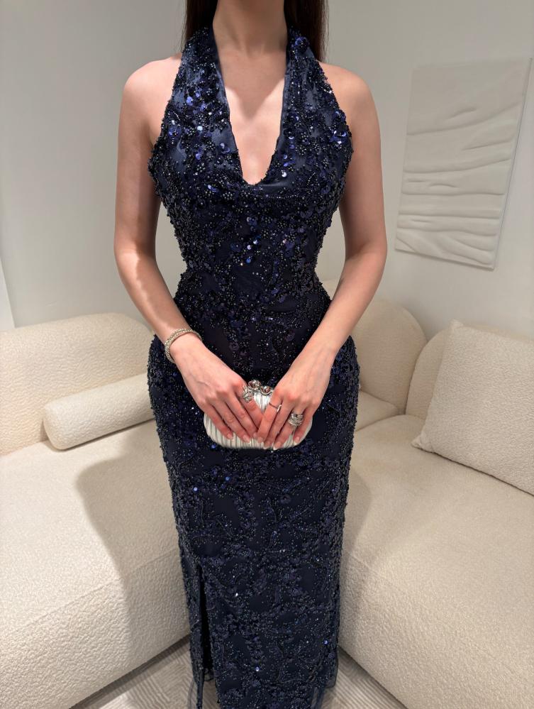 فستان كحلي داكن حرير مطرز بالترتر والخرز اللامع