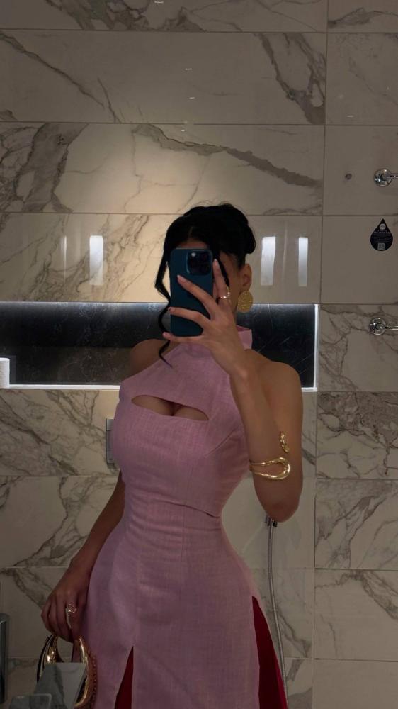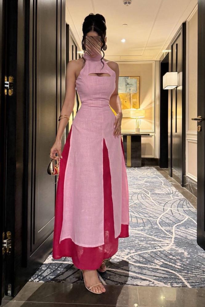 خامة الفستان مصنوعة من قماش خفيف وناعم، من الكتان المبطن، مما يجعله مثاليًا الألوان الوردية المتدرجة تضيف لمسة أنثوية ناعمة، بينما الفتحات الجانبية والتفاصيل الفريدة تعزز جاذبية التصميم.