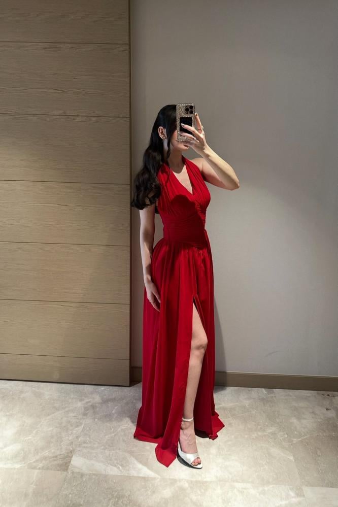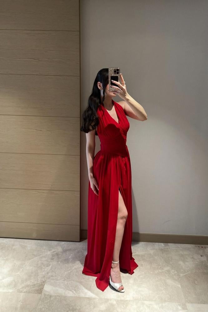• فستان طويل بتصميم هالتر يعانق القوام برقي ويجمع بين الأنوثة والجرأة.