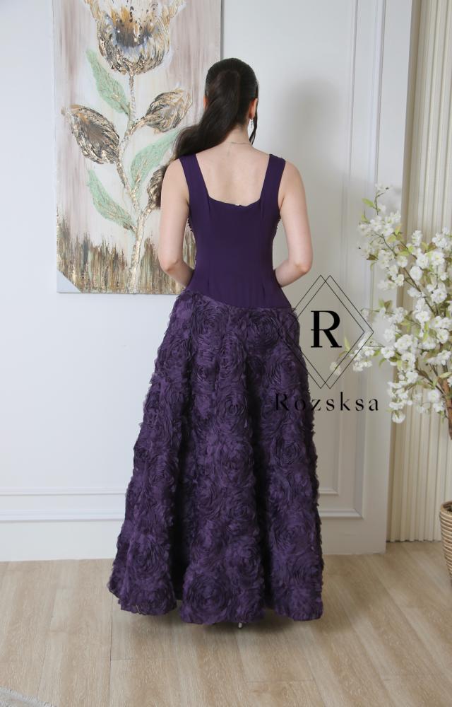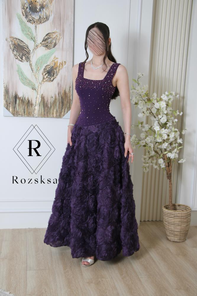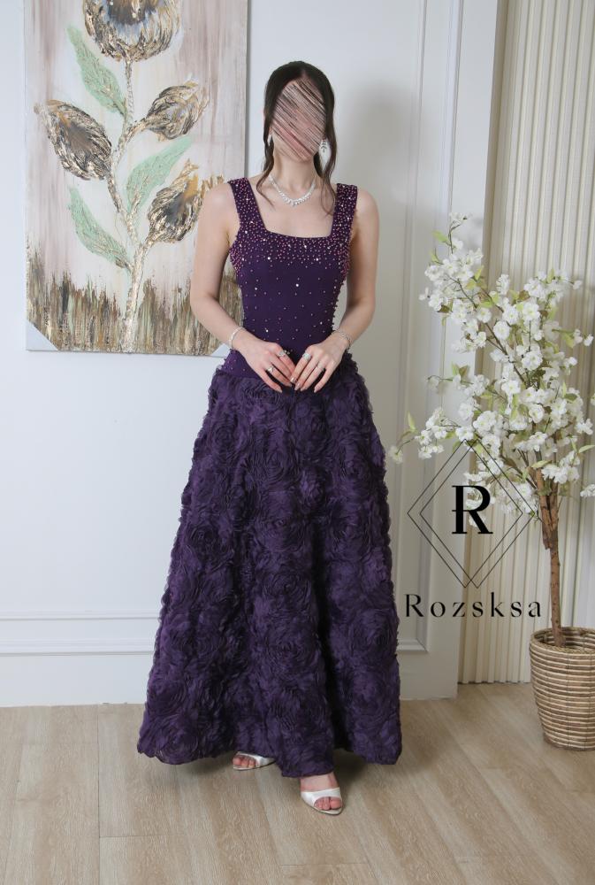 • فستان سهرة بنفسجي أنيق، يزين صدره ترصيع كريستالي لامع وتنورته مزدانة بورود ثلاثية الأبعاد فاخرة، يجمع بين البساطة والفخامة لإطلالة راقية في المناسبات