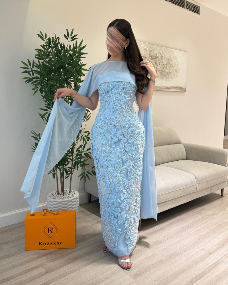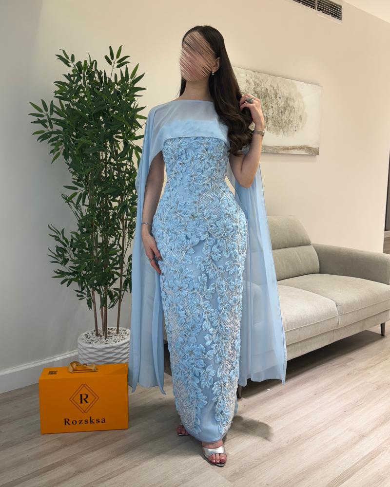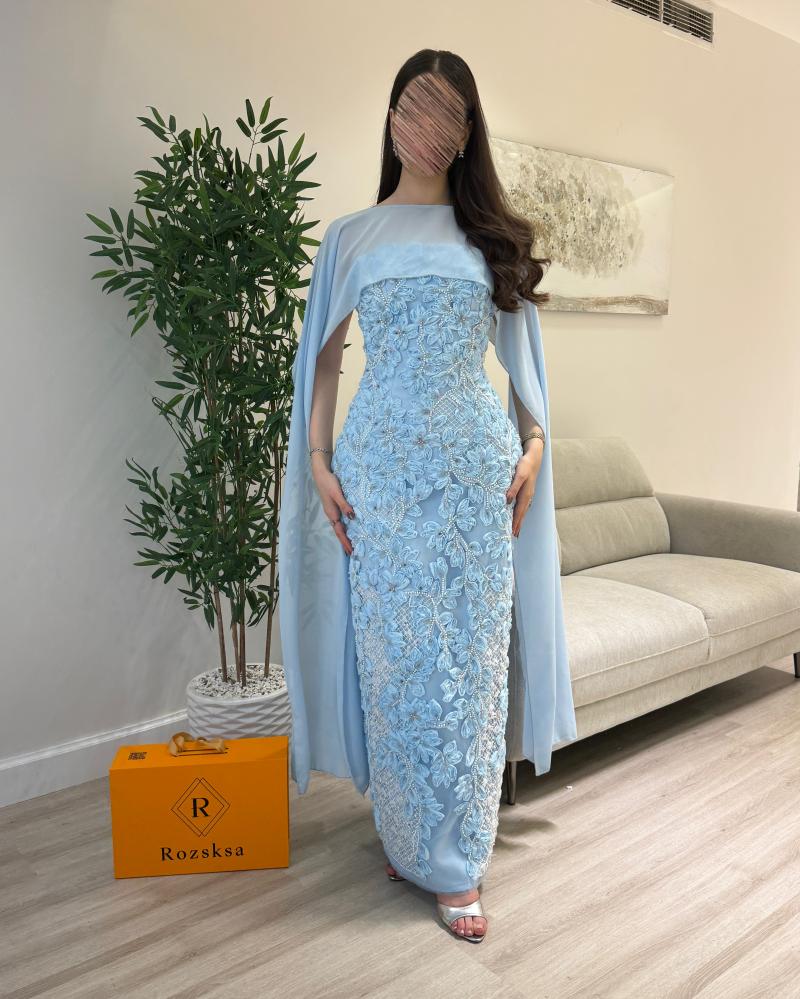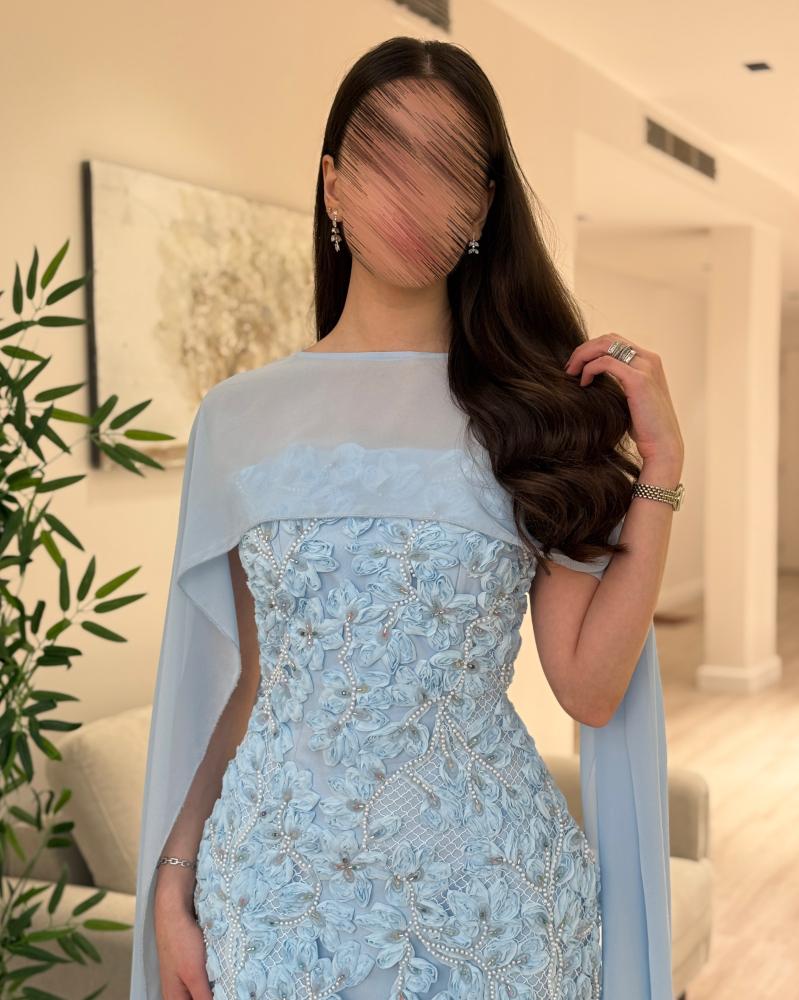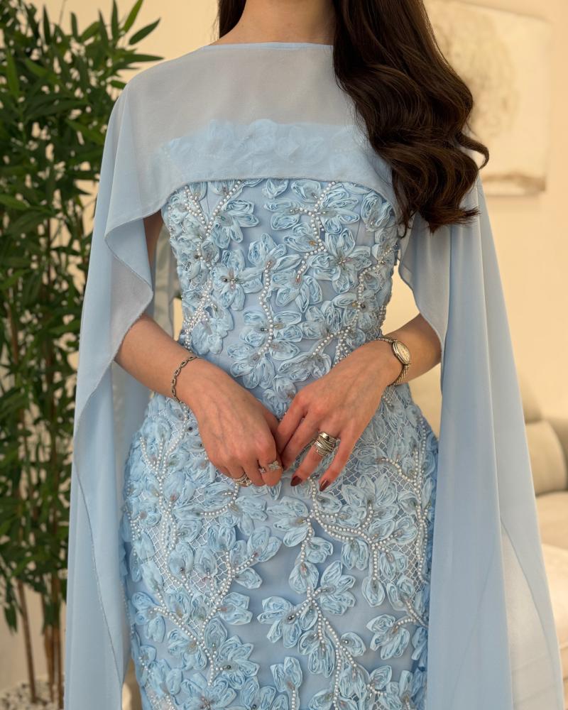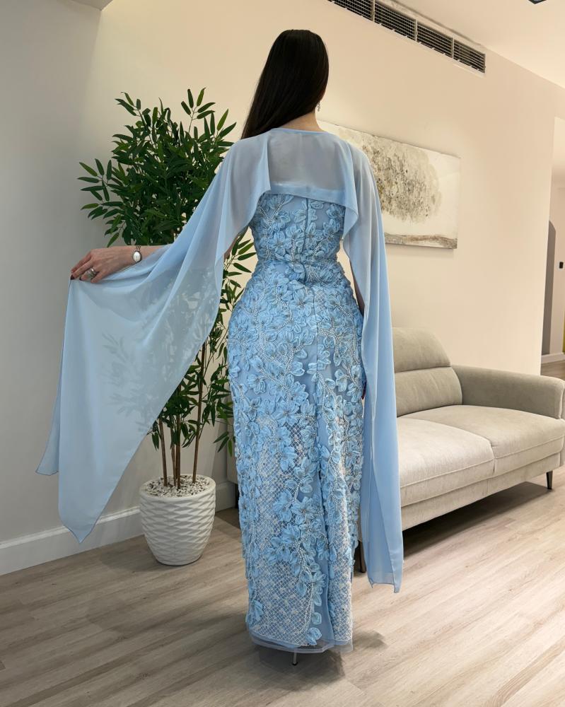 والشال المصاحب من شيفون خفيف شفاف بنفس درجة السماوي ليكمل الإطلالة بنعومة وانسيابية