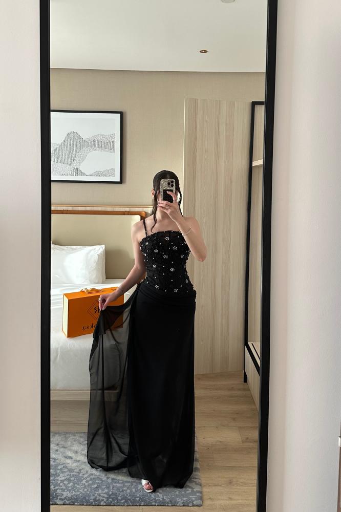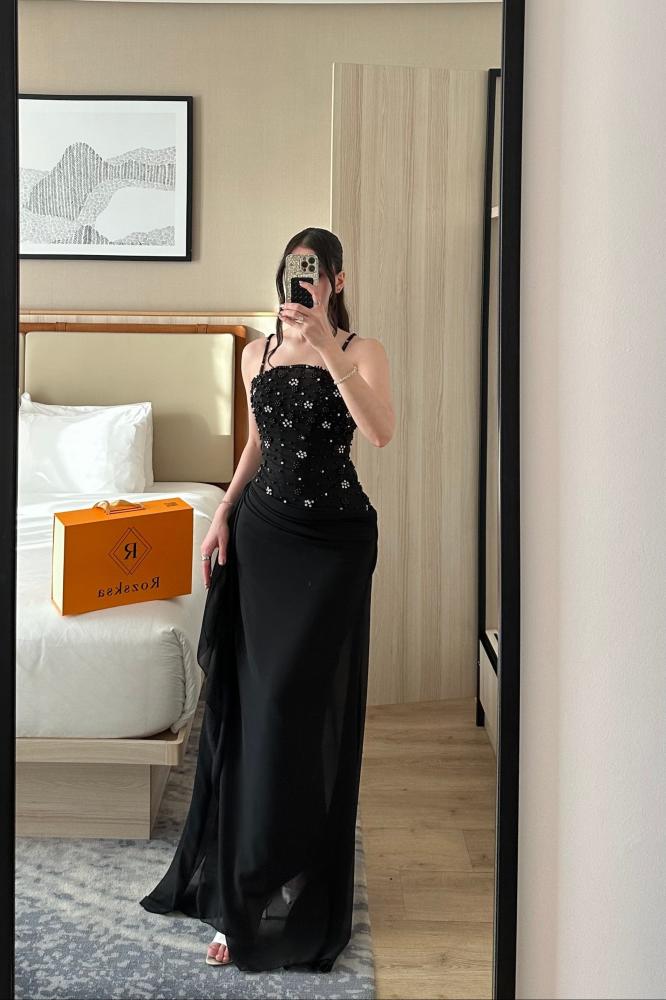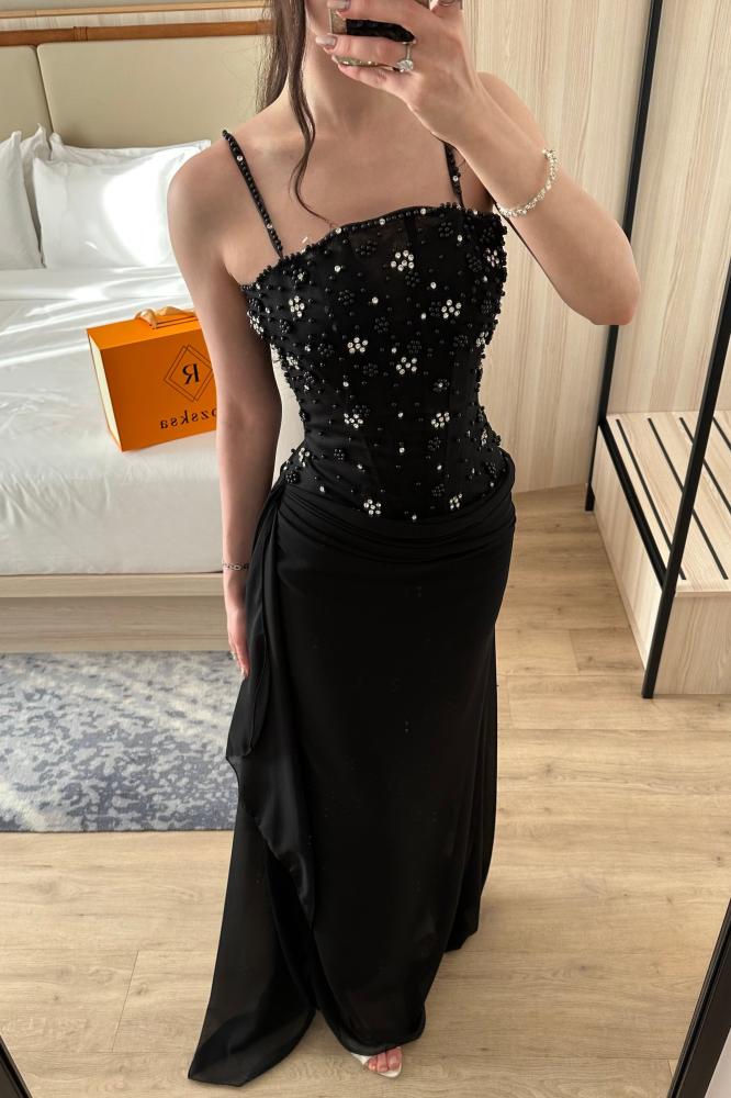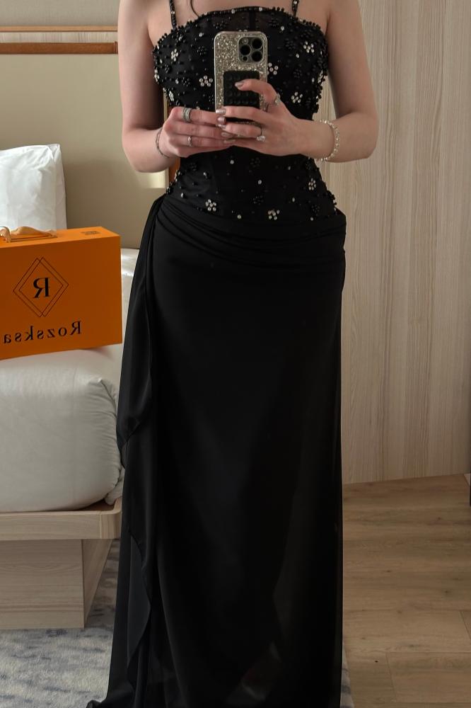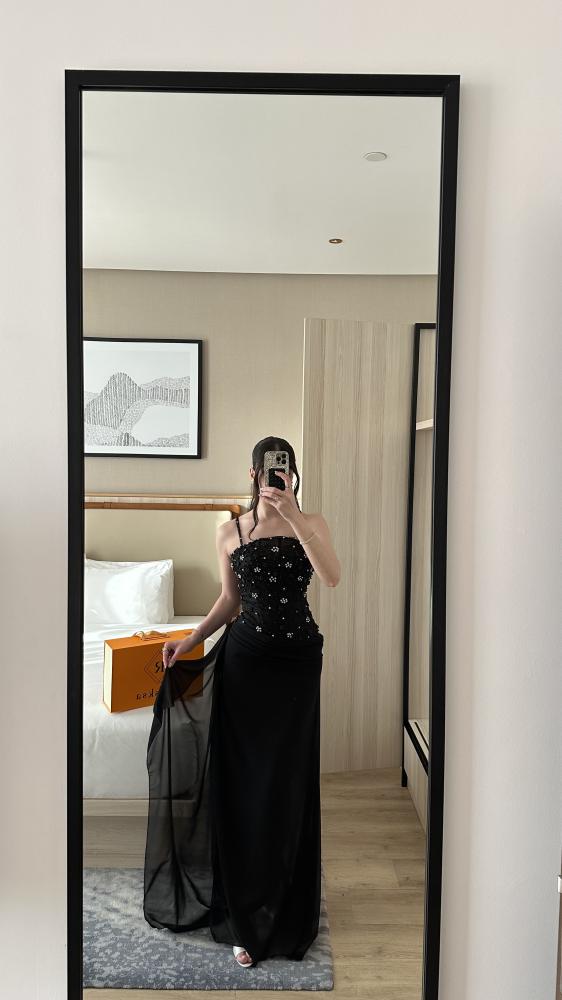 الفستان . الجزء العلوي ضيق (كورسيه) مزين بتطريزات من الخرز والكريستالات الصغيرة اللامعة على شكل زهور تضيف لمسة فاخرة وبراقة. له حمالات رفيعة مزدوجة تمنح إطلالة أنثوية ناعمة. أما الجزء السفلي فهو من قماش شيفون انسيابي واسع قليلًا مع شق