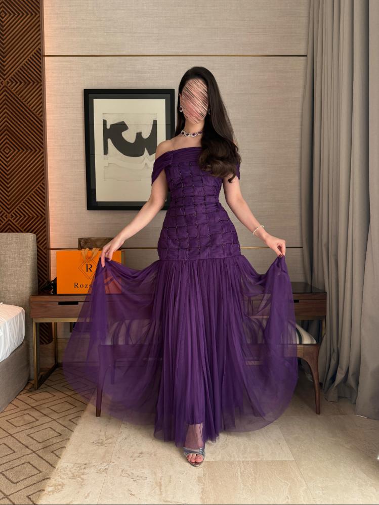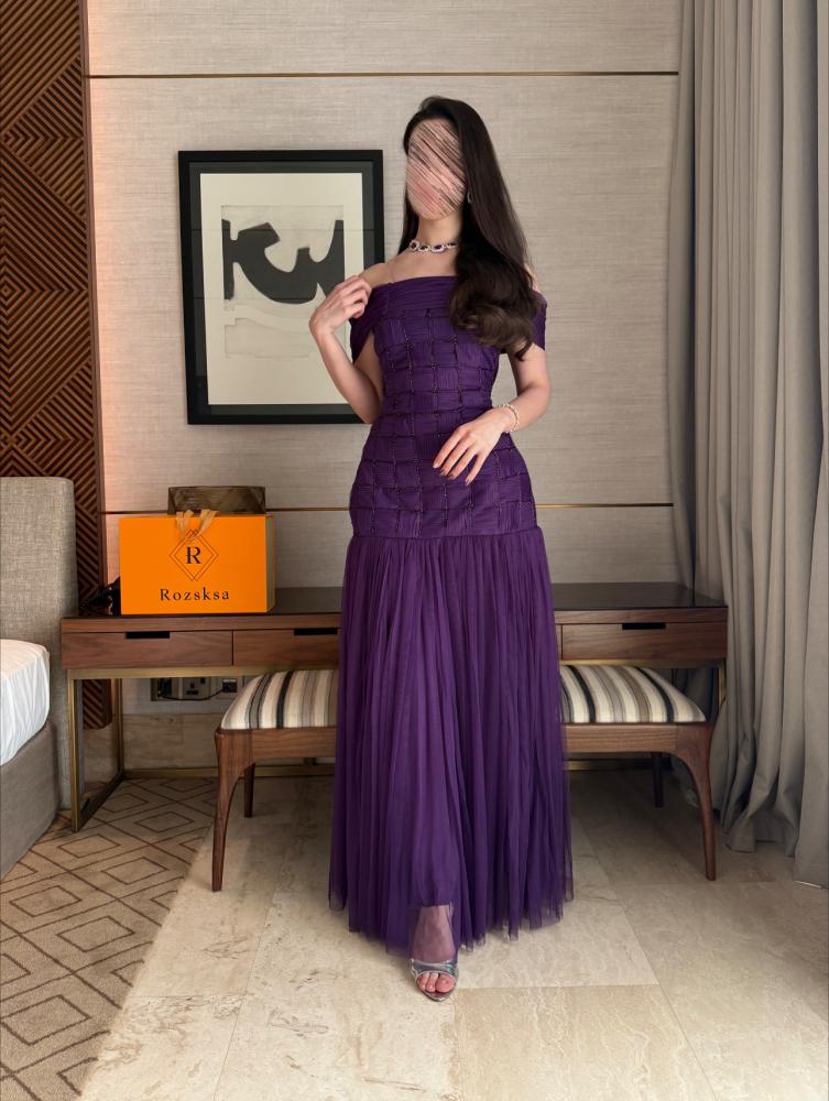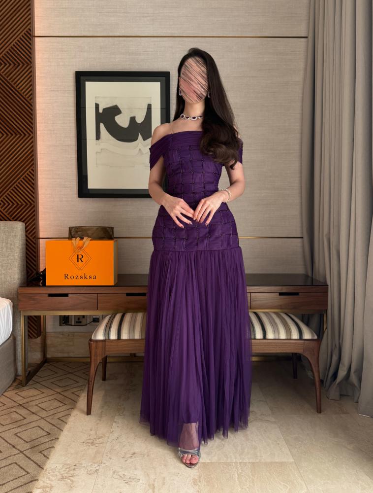 القماش: شيفون مطوي بتفاصيل هندسية دقيقة وتطريز ناعم