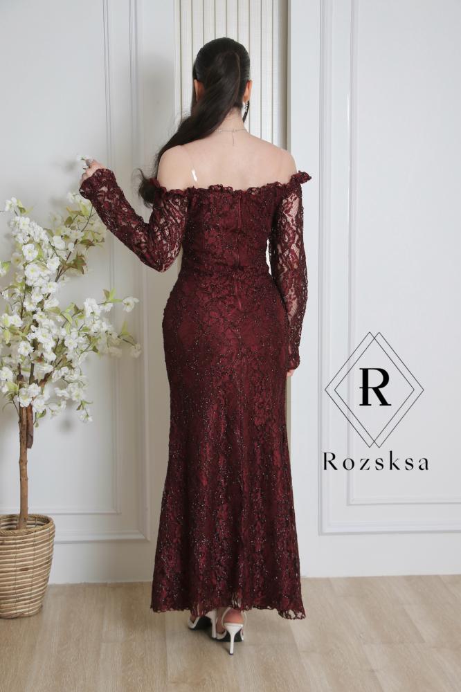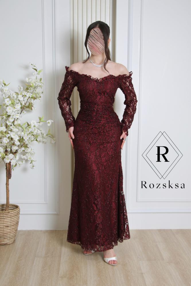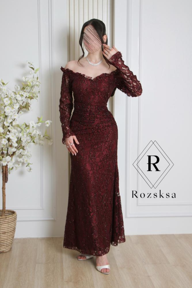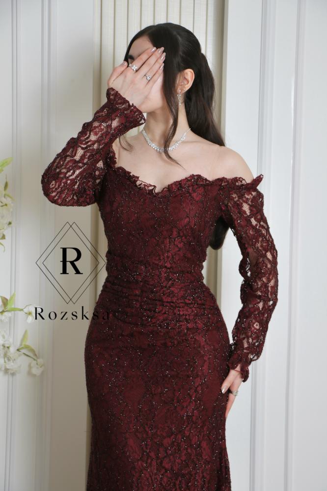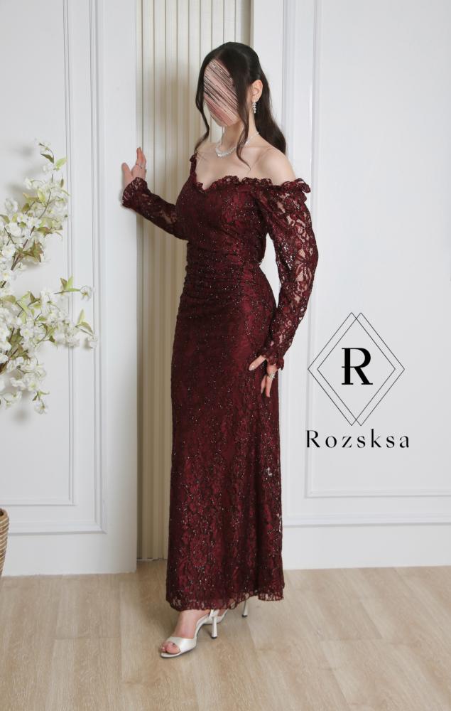 • الفستان مصنوع من دانتيل مطرّز بالخرز اللامع، يجمع بين نعومة الدانتيل وفخامة التطريز اليدوي ليمنح إطلالة راقية تناسب المناسبات المسائية