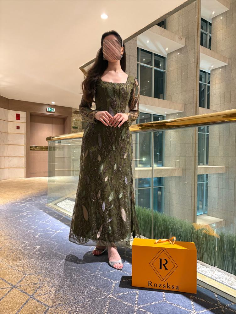 مصنوع من تول ناعم شفاف مزخرف بتطريز يدوي فاخر على شكل أوراق متداخلة، تعطي حركة طبيعية وأناقة متوازنة. البطانة الداخلية بلون زيتي فاتح تبرز جمال النقوش وتضيف عمقًا راقياً