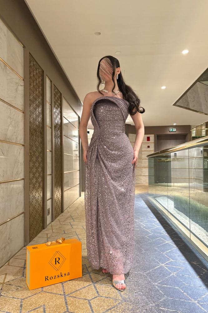 الفستان في الصورة باللون موف لامع (Lilac أو Mauve Shimmer) يعطي إحساساً بالنعومة والفخامة.