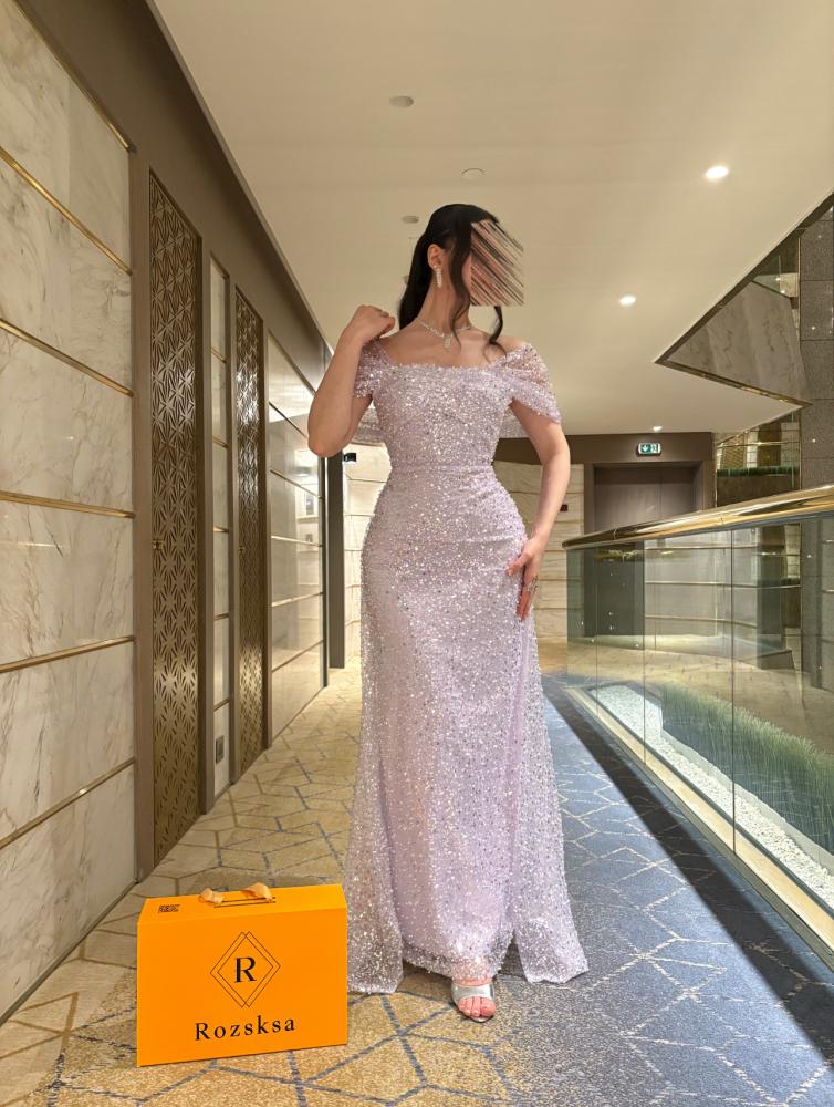 • التفاصيل: الفستان يمتد مع ذيل بسيط وشفاف من الخلف يضيف لمسة ملكية