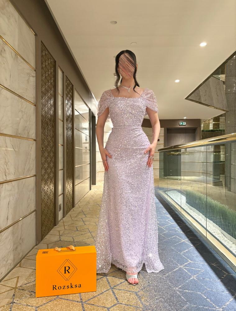 • الأكمام: قصيرة وشفافة، مصممة من نفس القماش المرصع بالترتر لإبراز أنوثة راقية.